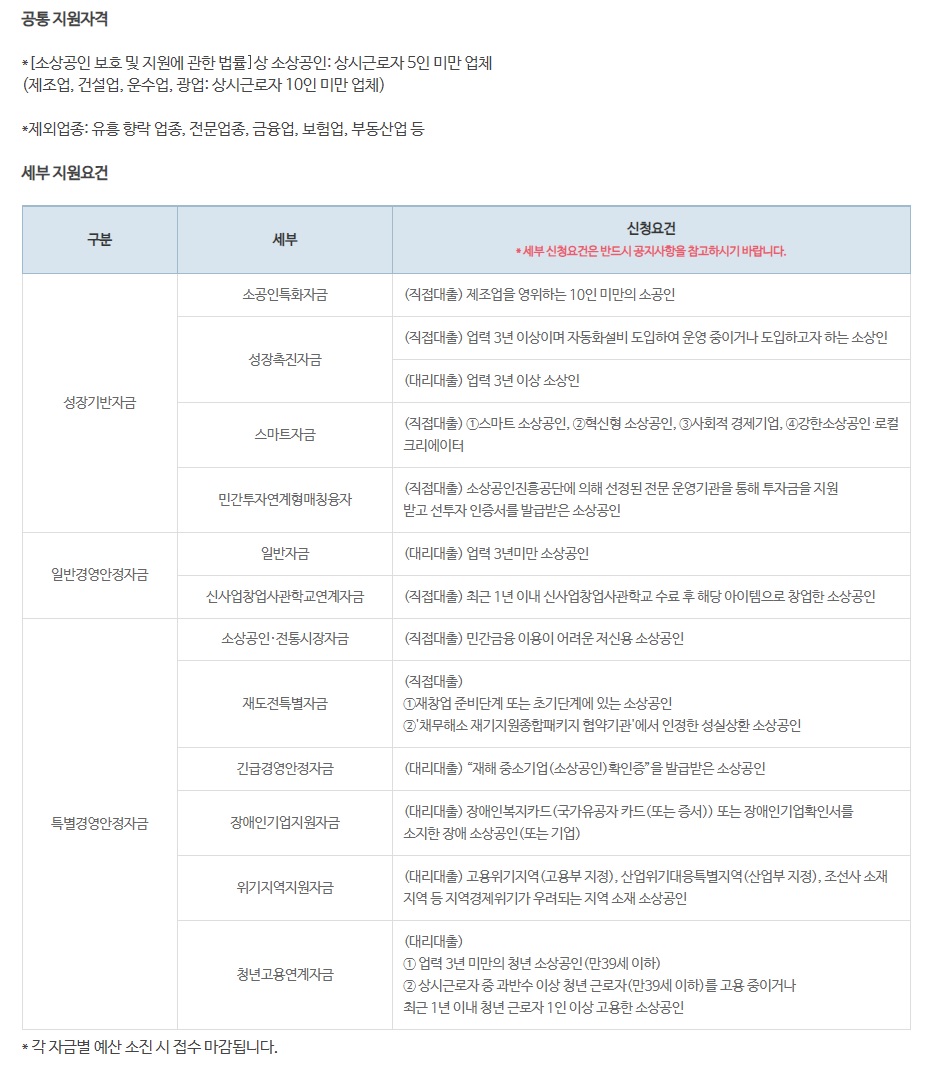 용도별 공통 지원자격은 '소상공인 보호 및 지원에 관한 법률'에 근거한 소상공인에 해당하는 사업자로, 상시 근로자 5인 미만 기업에 한해 지원이 가능합니다. 다만 업종에 따라 조건이 달라 제조업, 건설업, 운수업, 광업 등에 포함되면 정규직 10명 이내로 조건이 확대돼 신청할 수 있습니다.