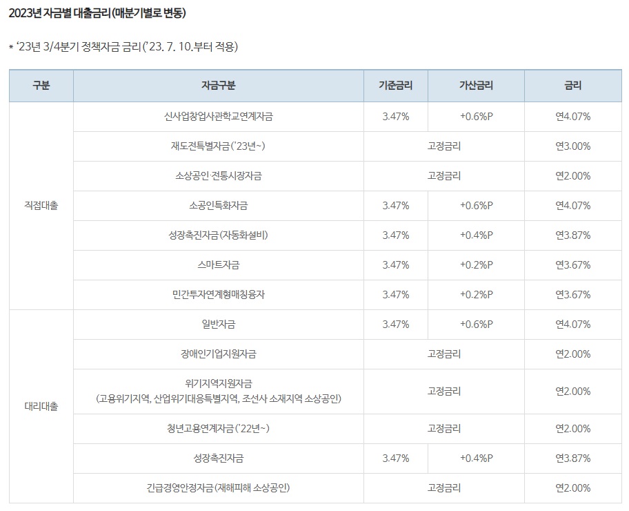 이와 같이 소상공인정책자금은 국내 기준금리보다 낮은 최저 연 2%의 금리로 사용할 수 있으니 사업장 조건을 정확히 확인해 자금 용도에 맞는 신청으로 활용해 주시기 바랍니다.